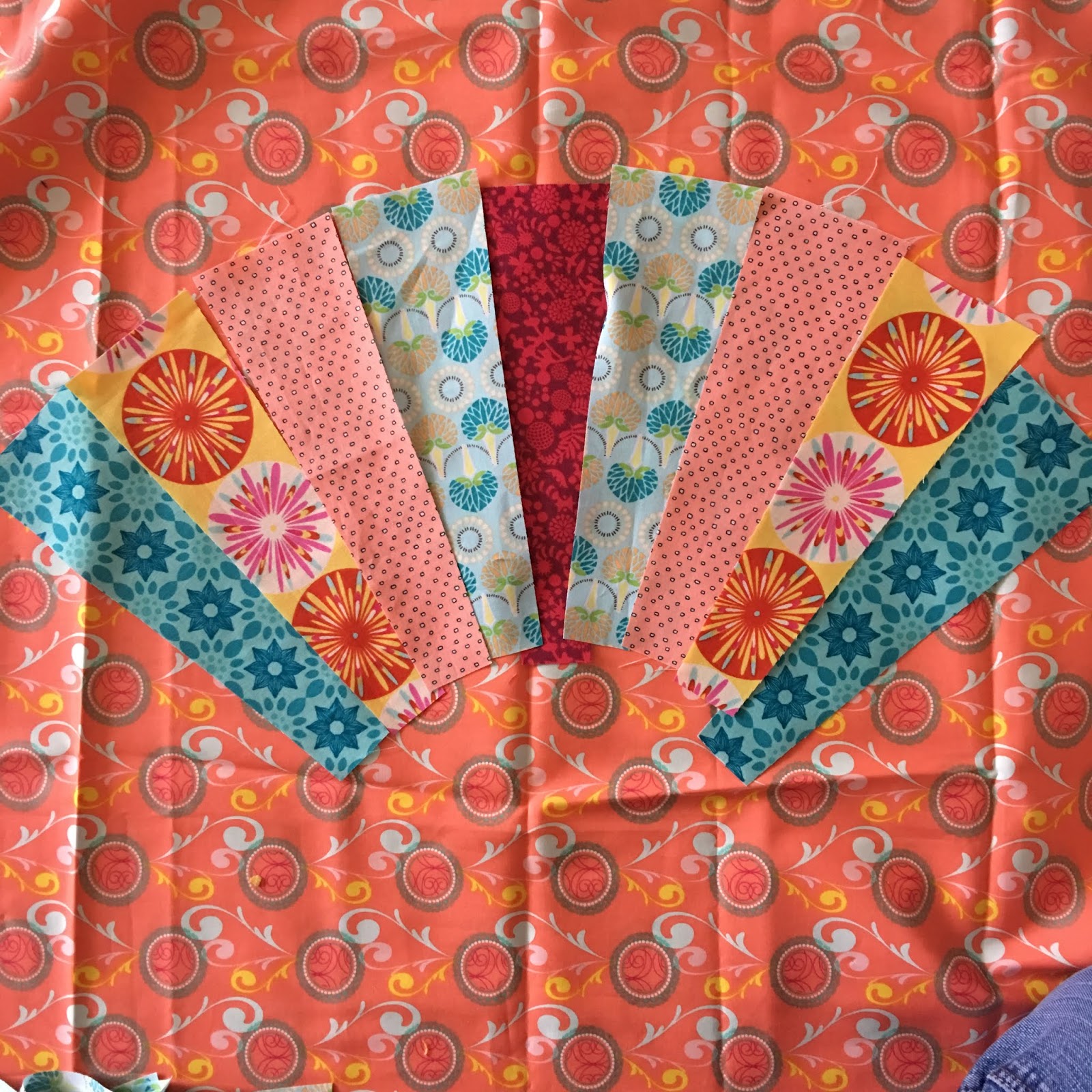 "Capitola Coral" measures 52"x52" and is an original design grounded in tradition with a modern twist. My latest obsession is a style that I refer to as Cohesive Scrappy. A dozen different fabrics from my stash were used and one was purchased from my LQS specifically for the project.